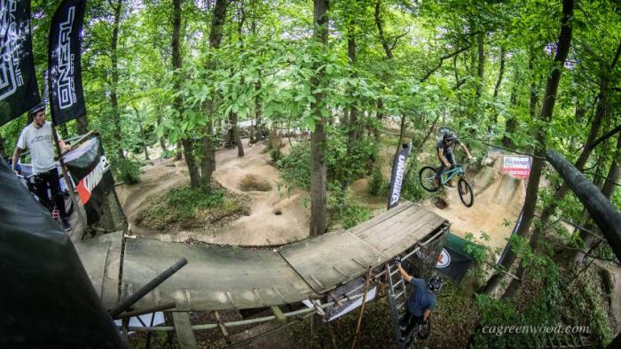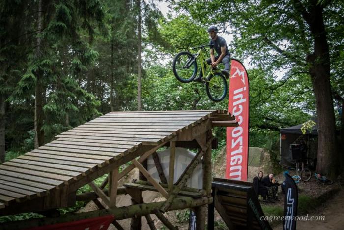 As I mentioned, Dirtwars runs on two lines at Holdshott, they start at the same place with a flat drop into a big left hand hip before dividing, before the Open/Amateurs branch left into ‘Comp Line’ consisting of two big, dirt to dirt doubles and finishing with a kicker onto mulch. The Pros head right into the ‘Slope Line’ hitting a speed/set up jump before launching off the boner log, up and down the whale tale structure before hitting the final kicker to mulch double.