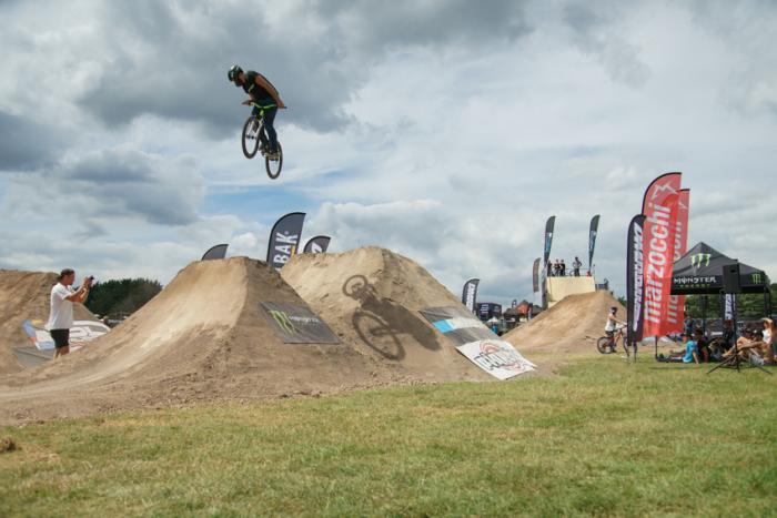 Jack Cardy and Callum Sherwood from Radical Bike Park stole the show tricking everything on course (apart from the step down which even the pros didnt trick). With Jack barspinning up the stepup and Callum throwing Suicides up it it was clear the main battle was between these two guys.