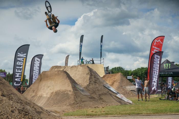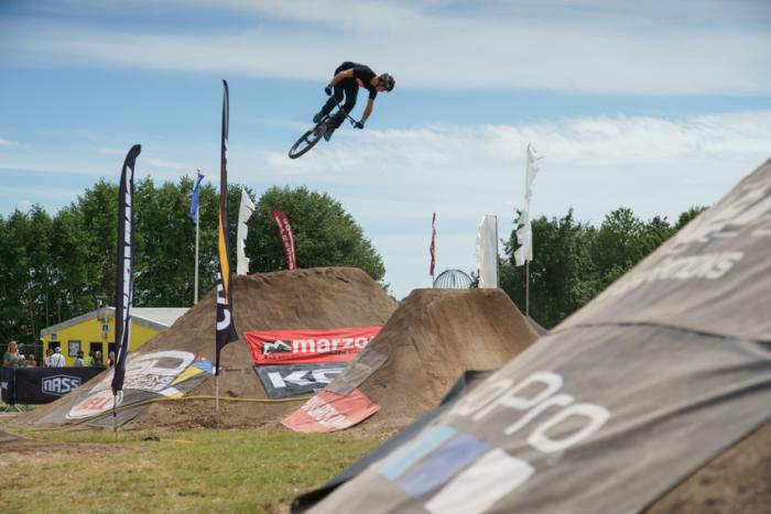 Kerry Pert was working in Greece a few days before the comp but quit and made his way back to England to hit up the NASS trails after not riding for a few months he soon got it dialed back in and sent some styled one footed tables and big flips on the last.